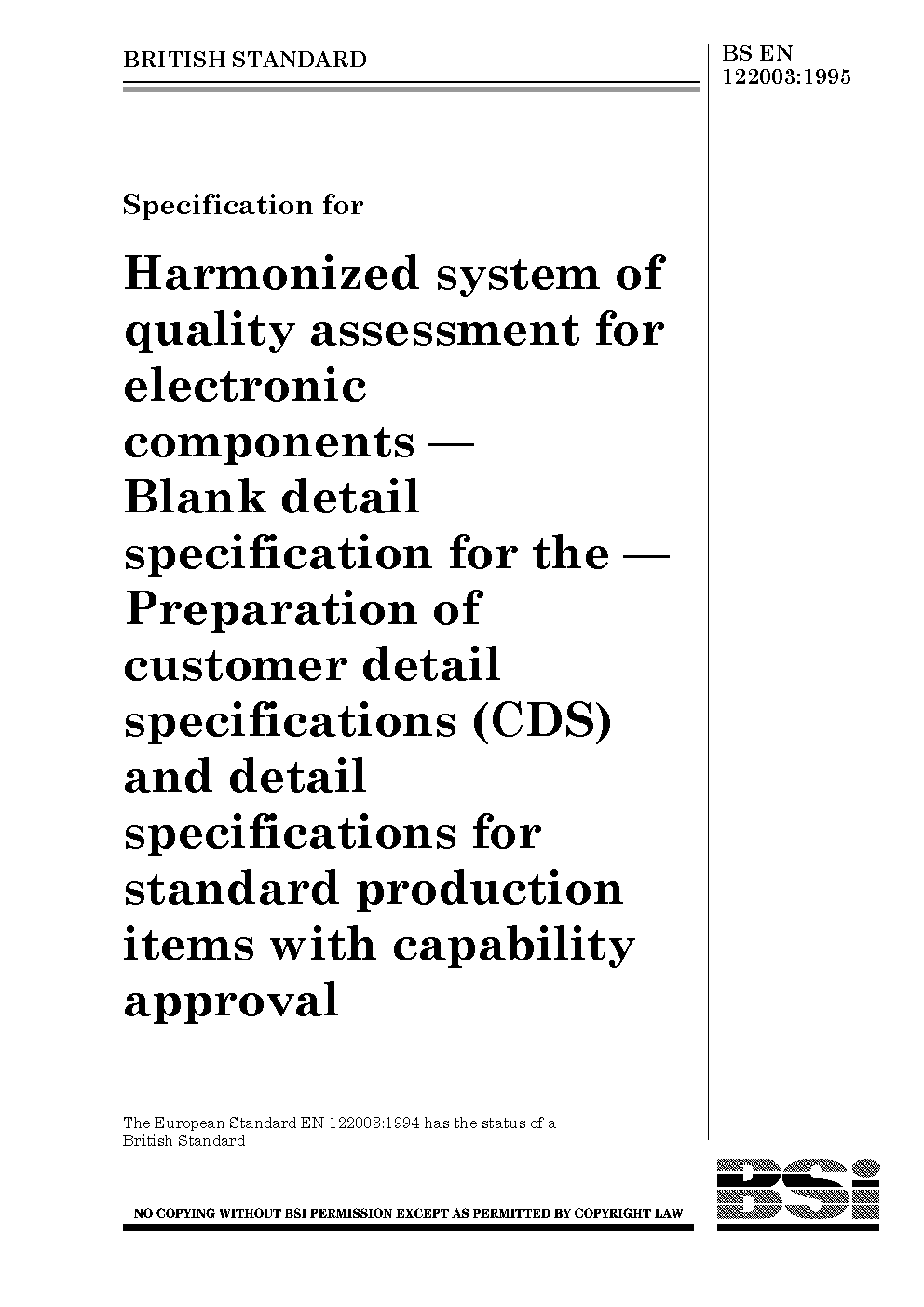 Specification for harmonized system of quality assessment for electronic components. Blank detail specification for the preparation of customer detail specifications (CDS) and detail specifications for standard production items with capability approval