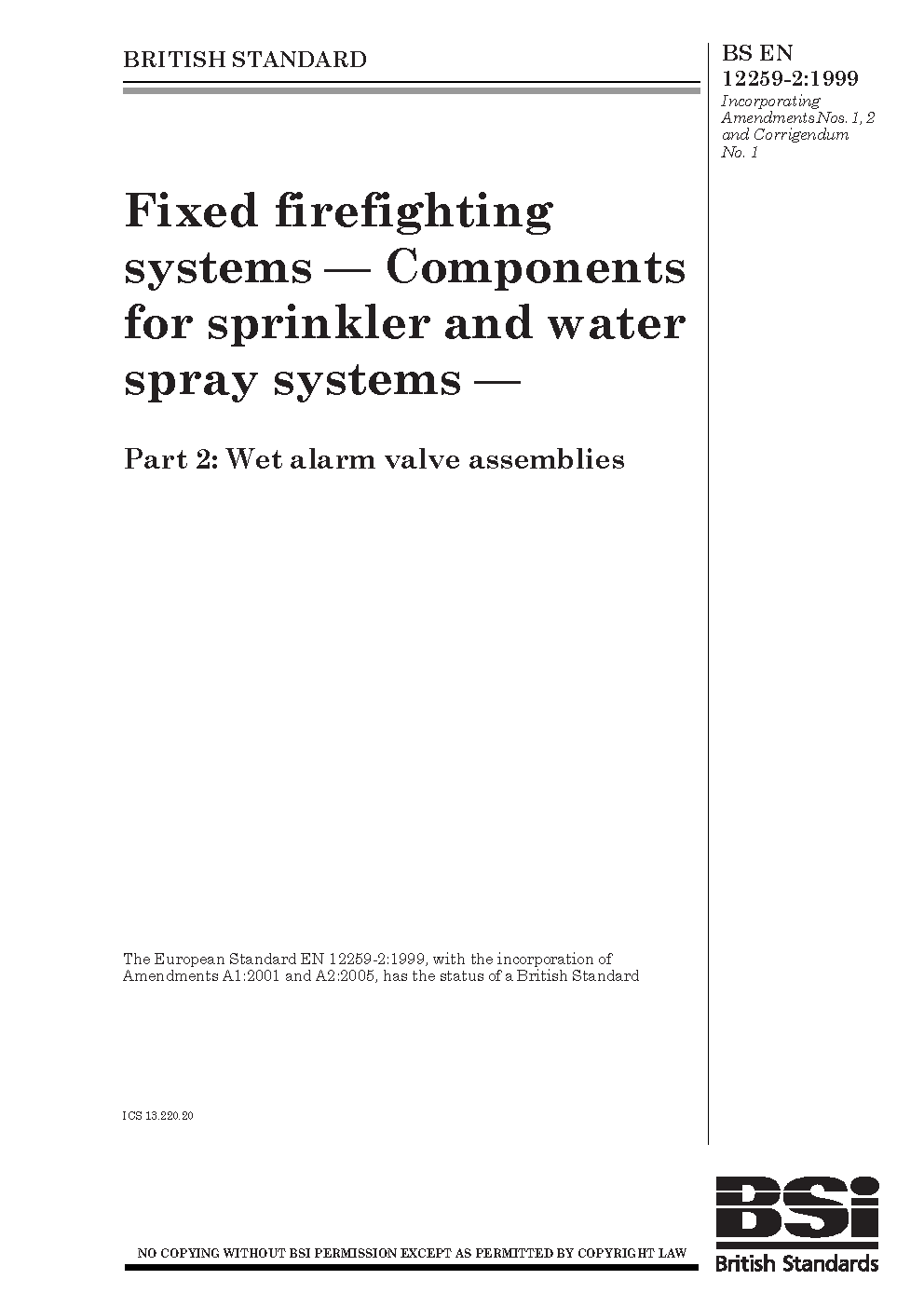 Fixed firefighting systems. Components for sprinkler and water spray systems Wet alarm valve assemblies