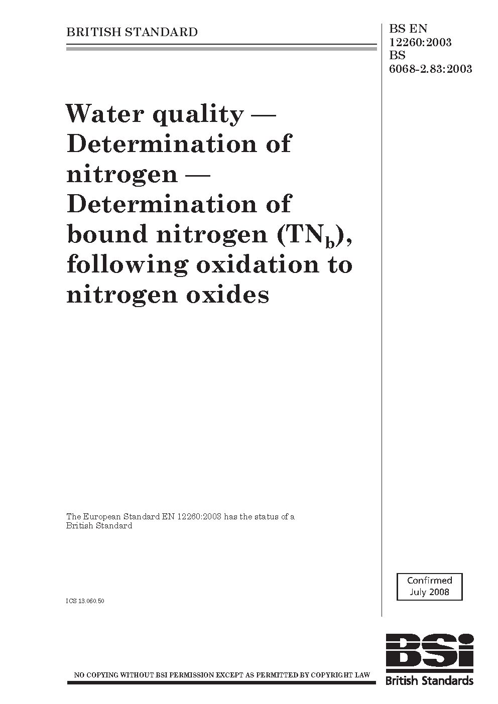 Water quality. Determination of nitrogen. Determination of bound nitrogen (TNb), following oxidation to nitrogen oxides