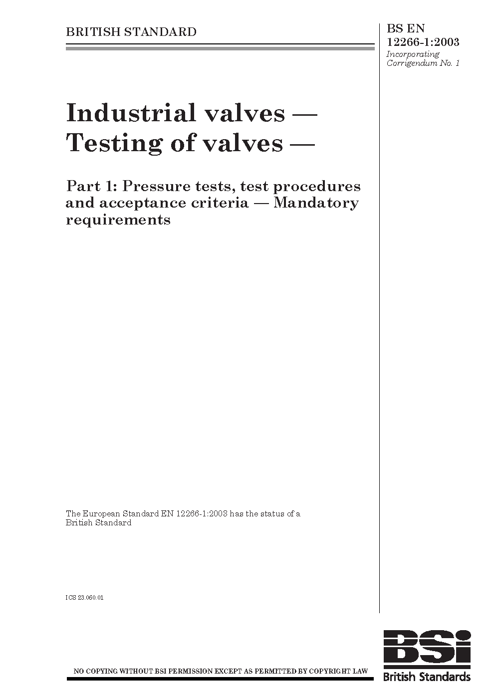 Industrial valves. Testing of valves Pressure tests, test procedures and acceptance criteria. Mandatory requirements