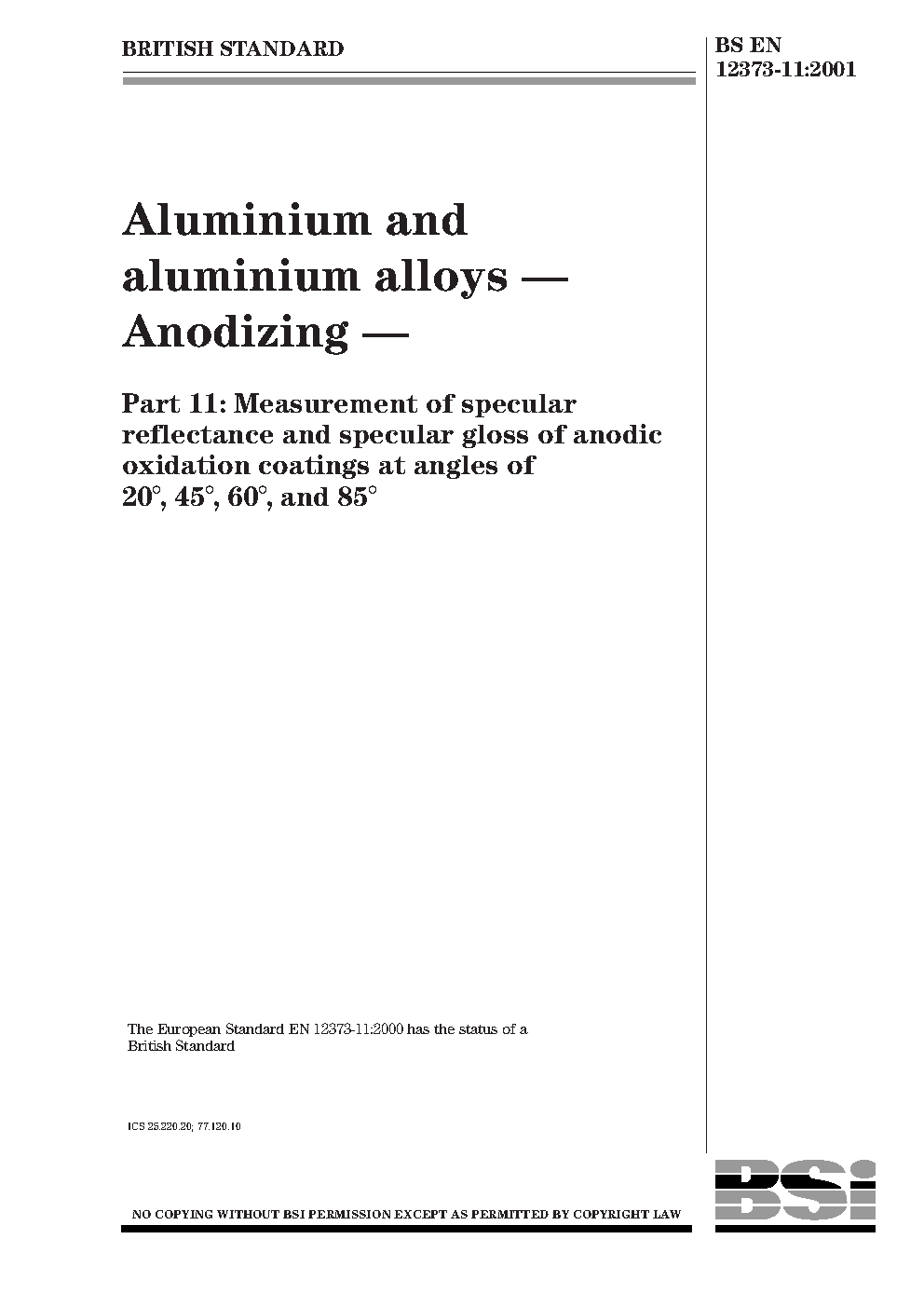 Aluminium and aluminium alloys. Anodizing Measurement of specular reflectance gloss anodic oxidation coatings at angles 20°, 45°, 60°, 85°