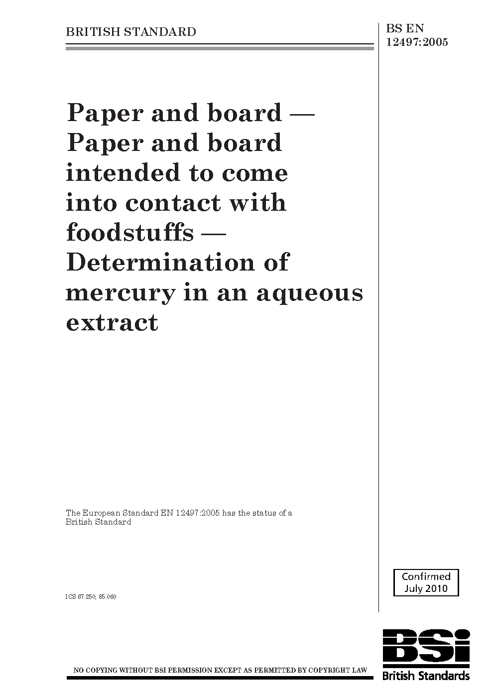 Mercury;Aqueous extraction methods;Determination of content;Materials in contact with food;Paper;Chemical analysis and testing;Atomic absorption spectrophotometry;Paper products;Board (paper)