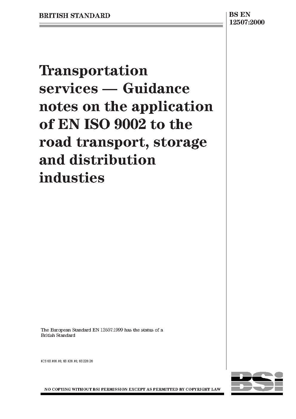 Transportation services. Guidance notes on the application of EN ISO 9001:2000 to the road transportation, storage, distribution and railway goods industries