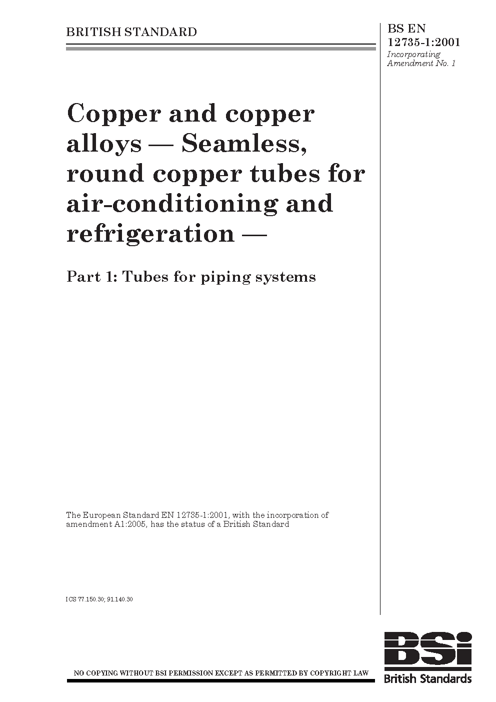 Copper and copper alloys. Seamless, round tubes for air conditioning refrigeration Tubes piping systems