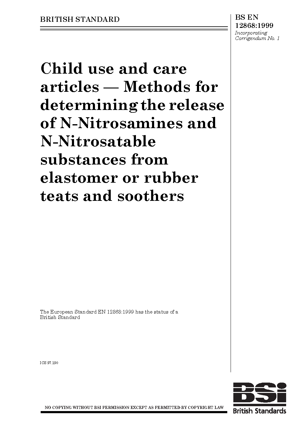 Child use and care articles. Methods for determining the release of N- nitrosamines and N-nitrosatable substances from elastomer orrubber teats and soothers
