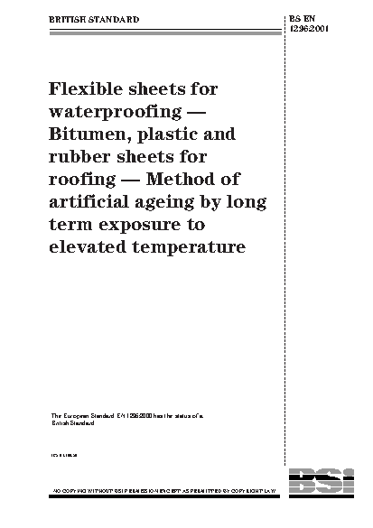 Thermal testing;Bituminous products;Construction materials;Sheet materials;Rubber;Waterproofing materials;Heating tests;Sheet roof coverings;Artificial ageing tests;Plastics;Roof coverings;Flexible materials;High-temperature testing;Bitumens