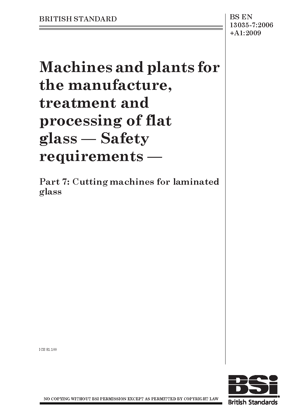 Machines and plants for the manufacture, treatment processing of flat glass. Safety requirements Cutting machines laminated glass