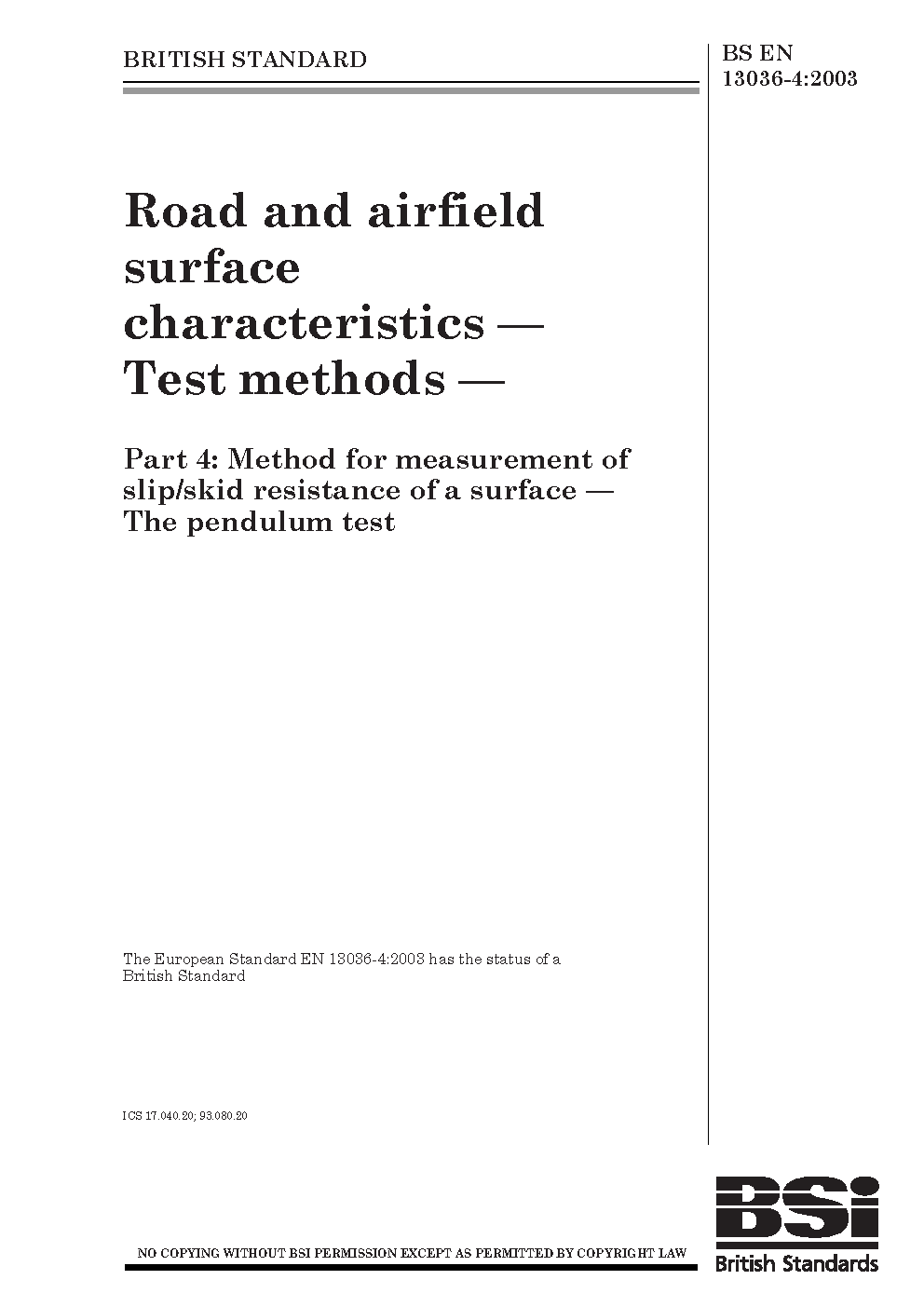 Road and airfield surface characteristics. Test methods Method for measurement of slip/skid resistance a surface: The pendulum test
