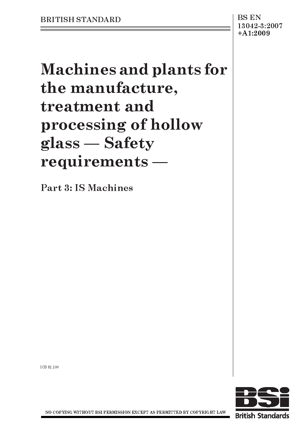 Machines and plants for the manufacture, treatment processing of hollow glass. Safety requirements IS
