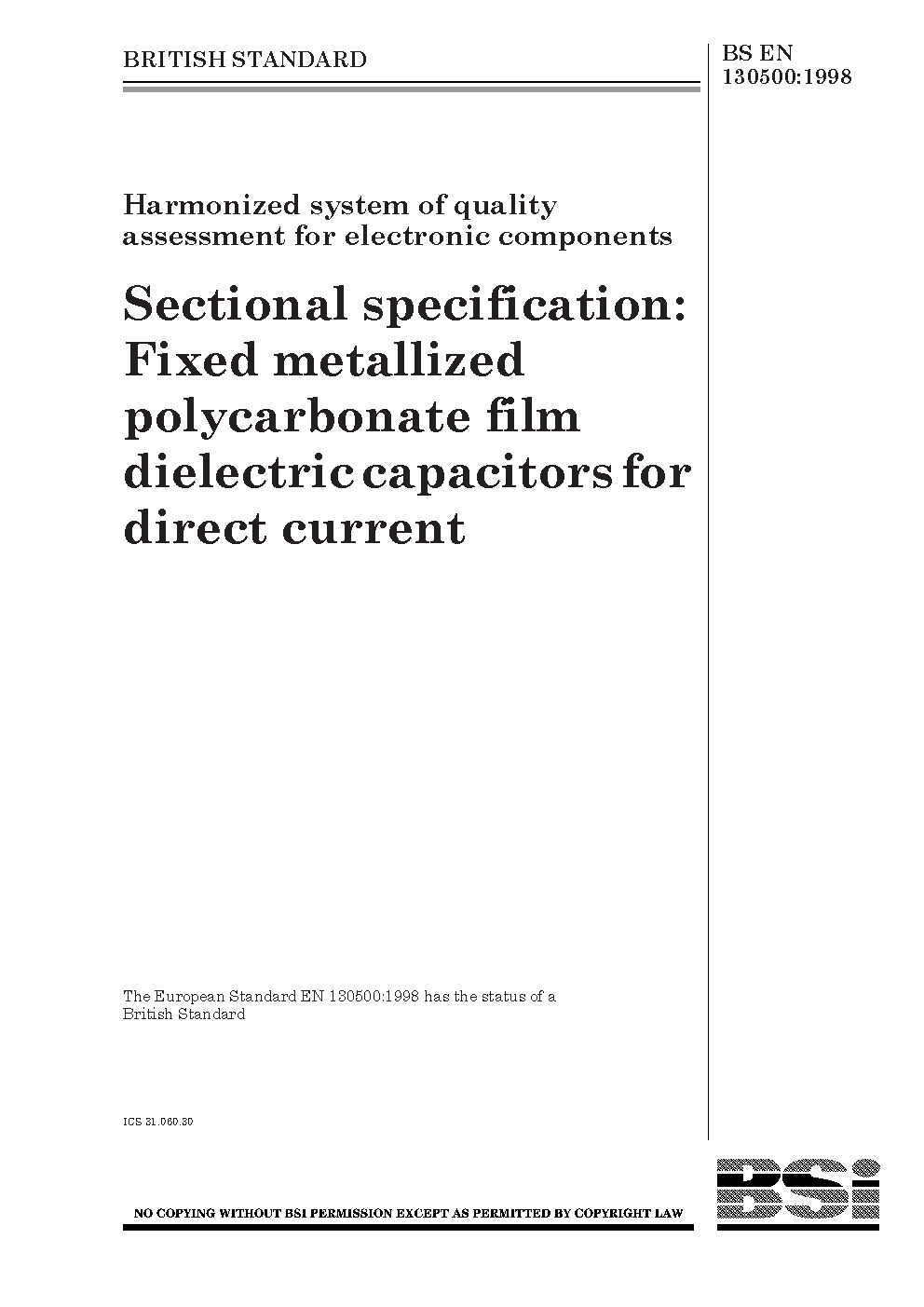 Harmonized system of quality assessment for electronic components. Sectional specification: fixed metallized polycarbonate film dielectric capacitors for direct current