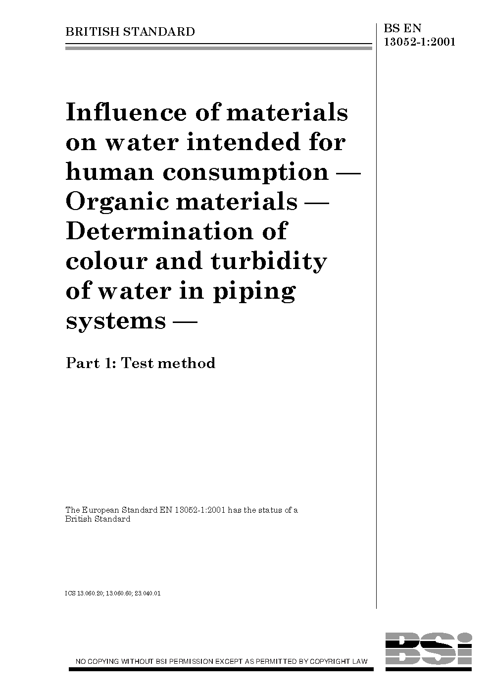 Influence of materials on water intended for human consumption. Organic materials. Determination colour and turbidity in piping systems Test method