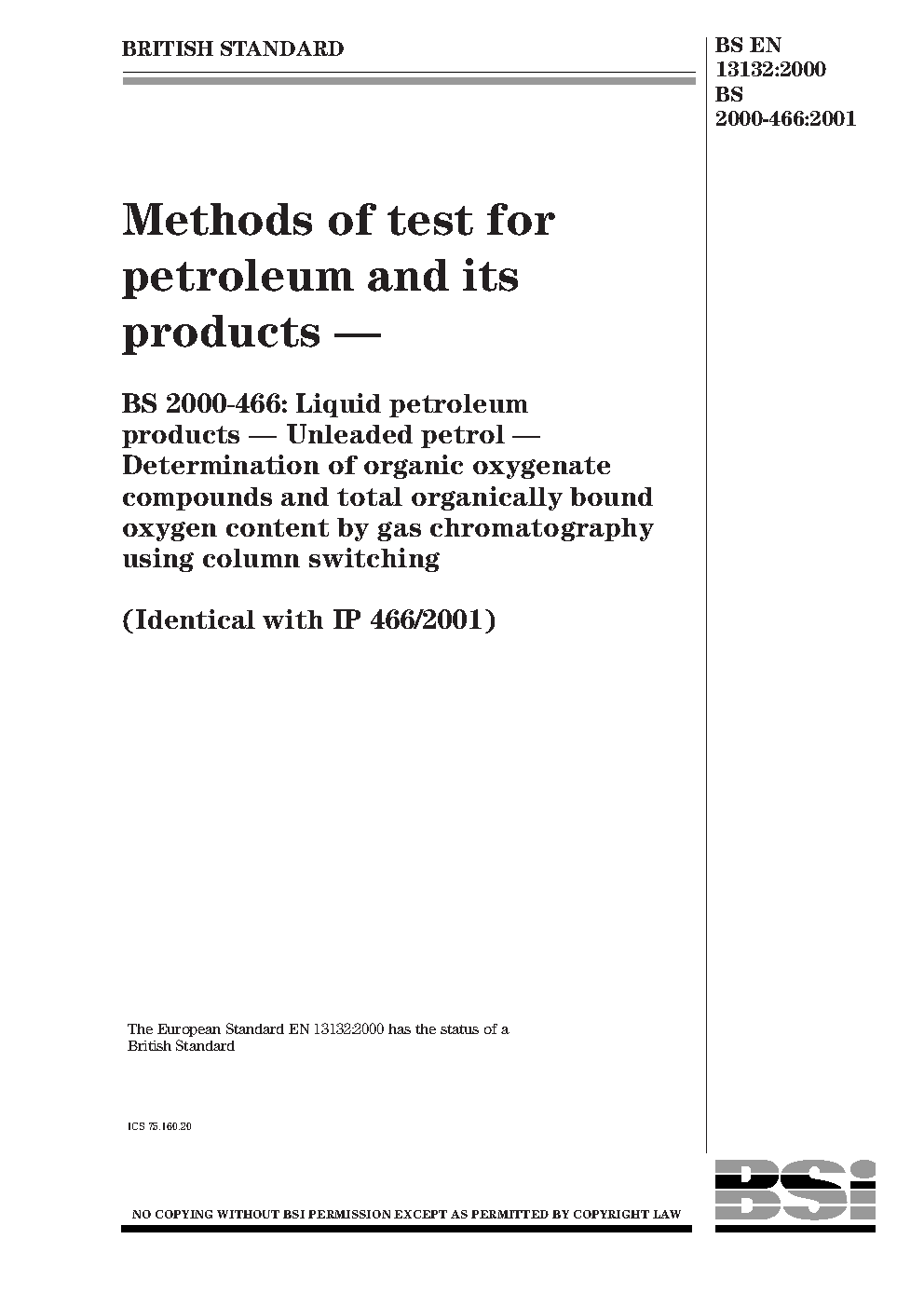 Methods of test for petroleum and its products. Liquid petroleum products. Unleaded petrol. Determination of organic oxygenate compounds and total organically bound oxygen content by gas chromatography using column switching