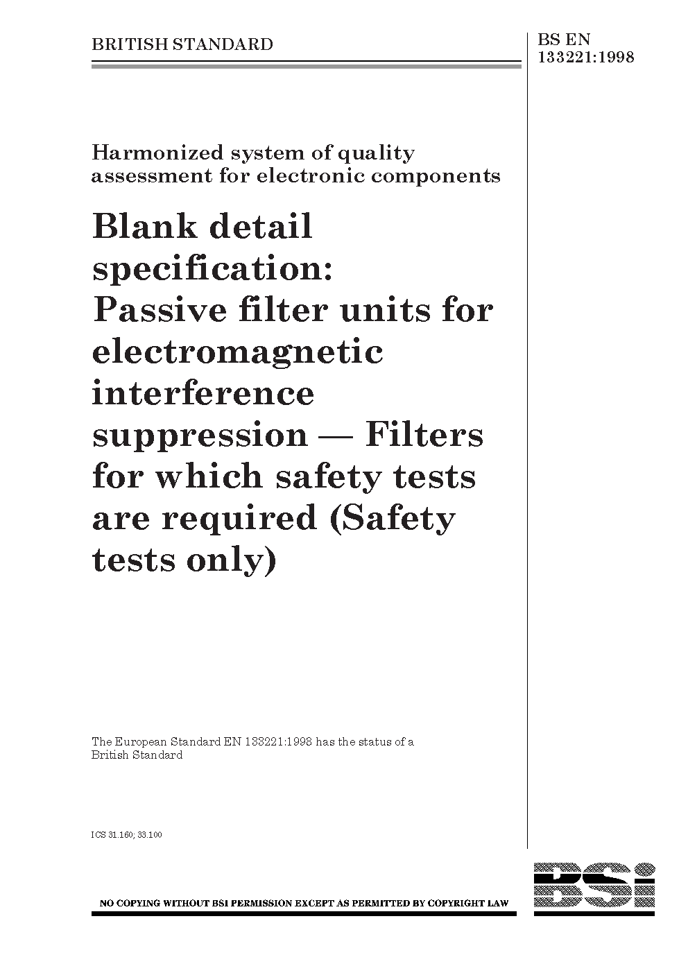 Harmonized system of quality assessment for electronic components. Blank detail specification: passive filter units for electromagnetic interference suppression. Filters for which safety tests are required (safety tests only)