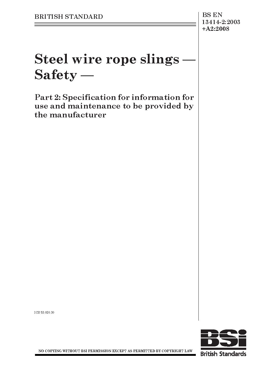 Steel wire rope slings. Safety Specification for information use and maintenance to be provided by the manufacturer