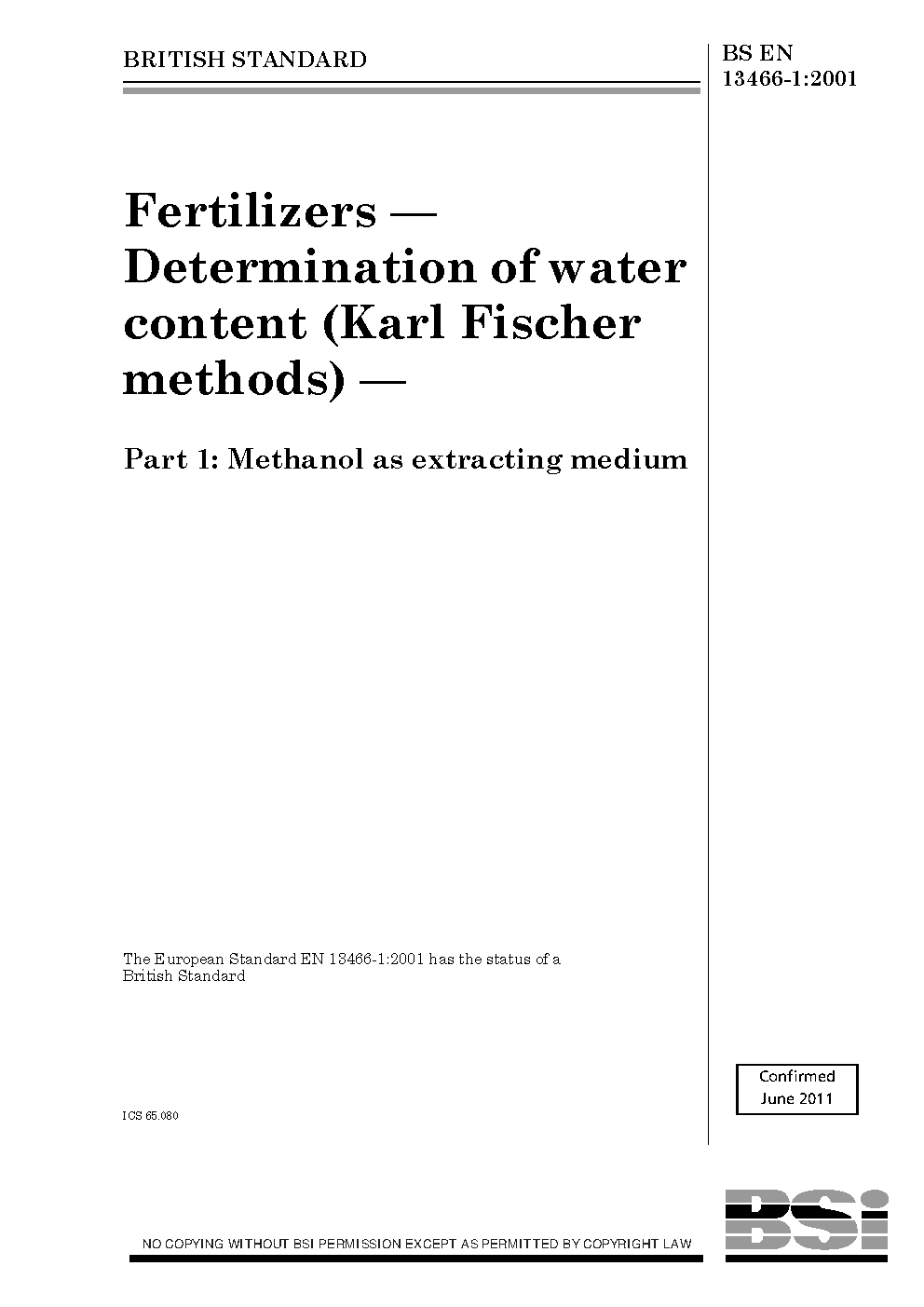 Fertilizers. Determination of water content (Karl Fischer methods) Methanol as extracting medium