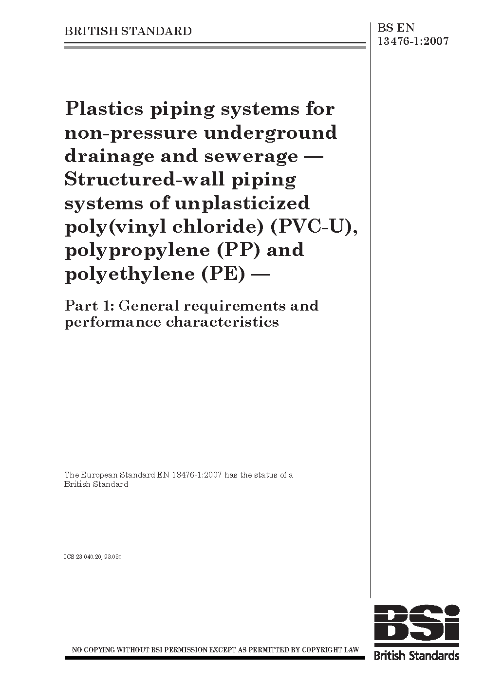 Plastics piping systems for non-pressure underground drains and sewers. Structured-wall of unplasticized poly(vinyl chloride) (PVC-U), polypropylene (PP) polyethylene (PE) General requirements performance characteristics