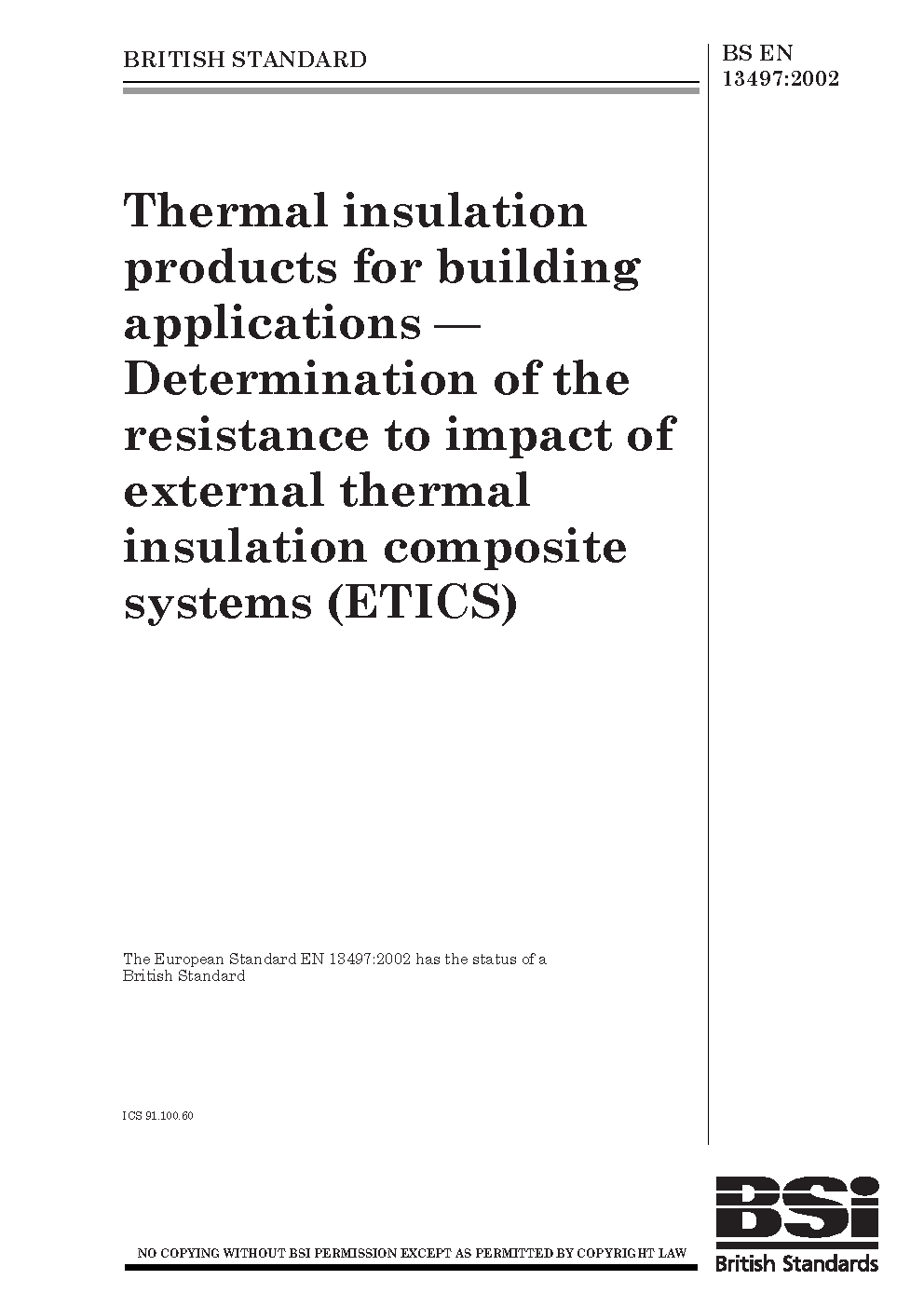 Thermal insulation products for building applications. Determination of the resistance to impact of external thermal insulation composite systems (ETICS)