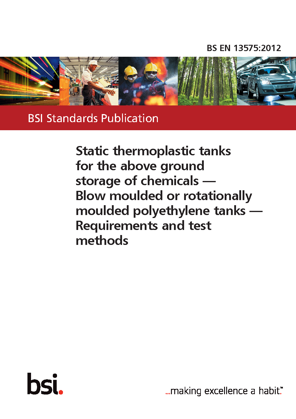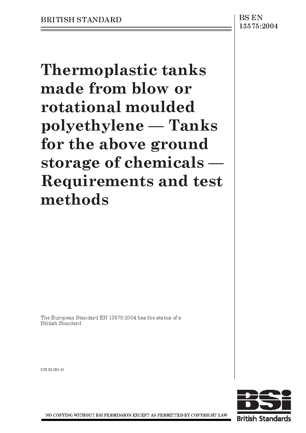 Thermoplastics tanks made from blow or rotational moulded polyethylene. Tanks for the above ground storage of chemicals. Requirements and test methods