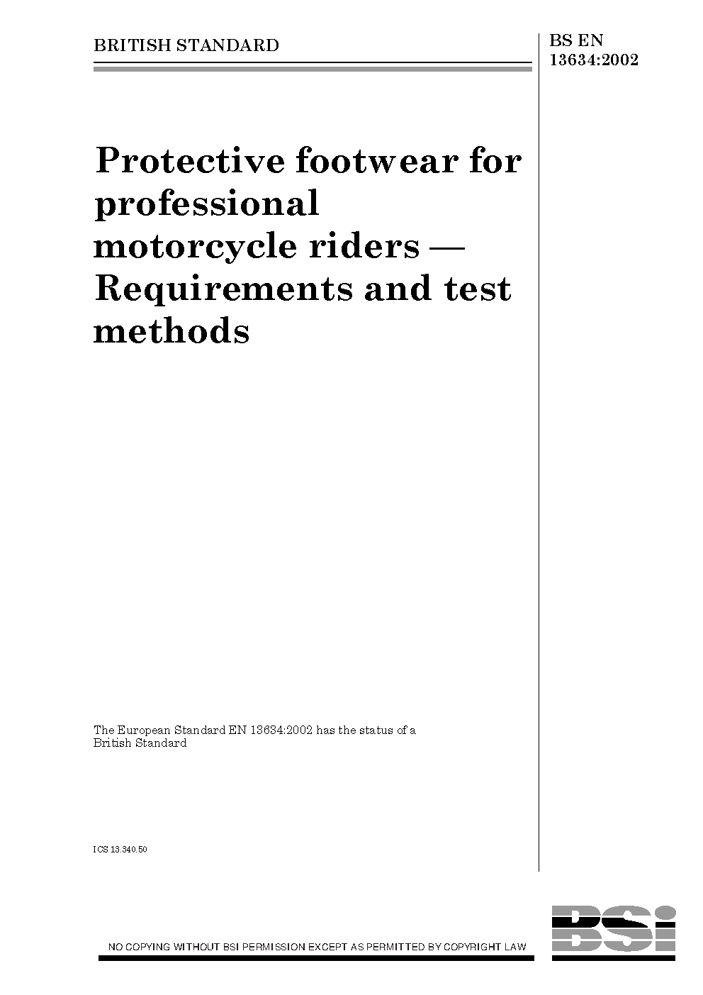 Cleaning;Design;Marking;Ergonomics;Protective footwear;Protective clothing;Motor cyclists;Performance testing;Performance;Instructions for use;Footwear;Mechanical properties of materials