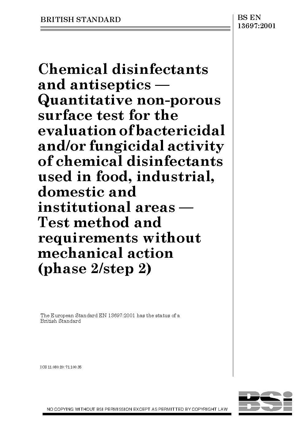 Chemical disinfectants and antiseptics, Quantitative non-porous surface test for the evaluation of bactericidal and/or fungicidal activity of chemical disinfectants used in food, industrial, domestic and institutional areas. Test method and requirements without mechanical action (phase 2, step 2)