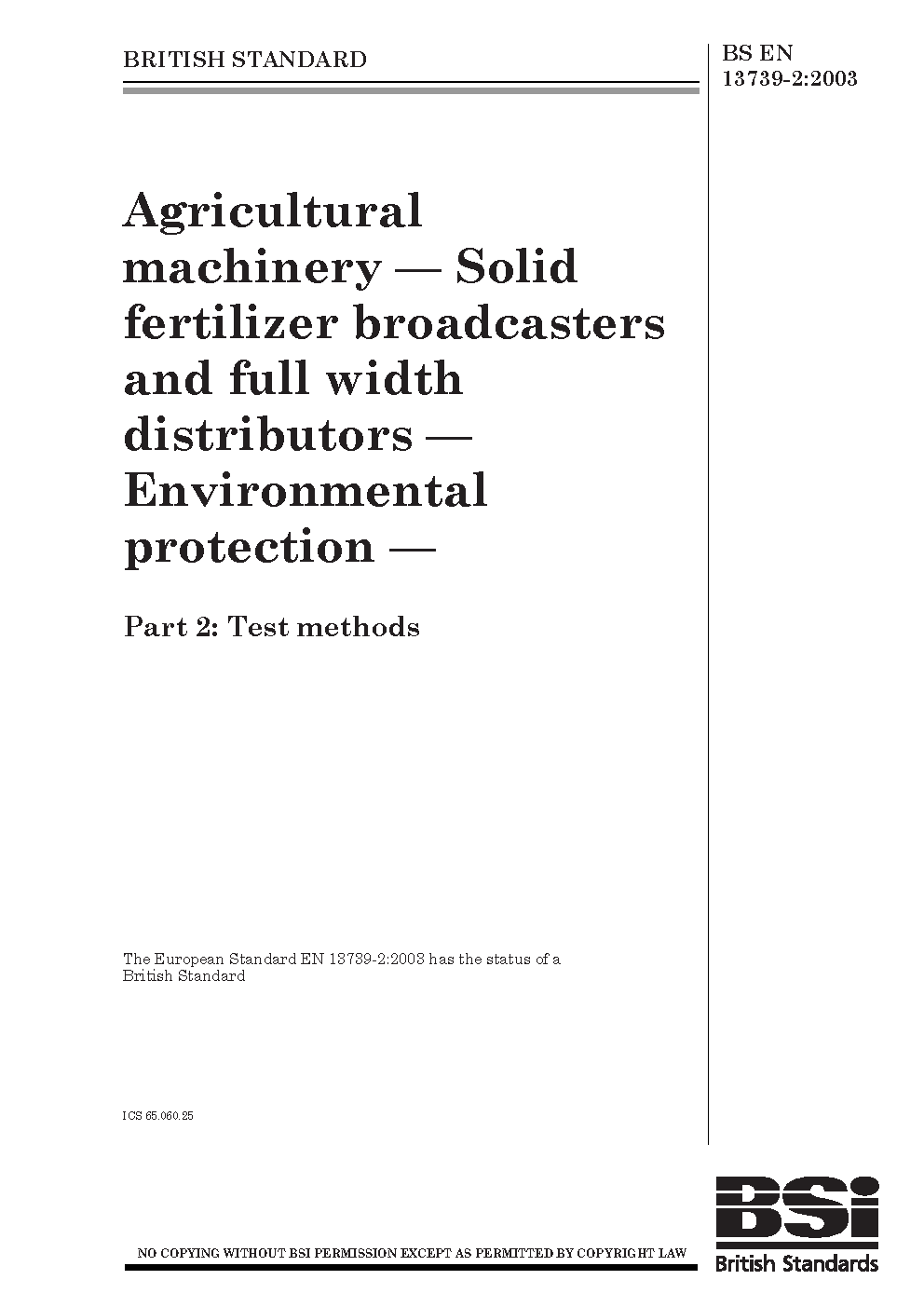 Agricultural machinery. Solid fertilizer broadcasters and full width distributors. Environmental protection Test methods