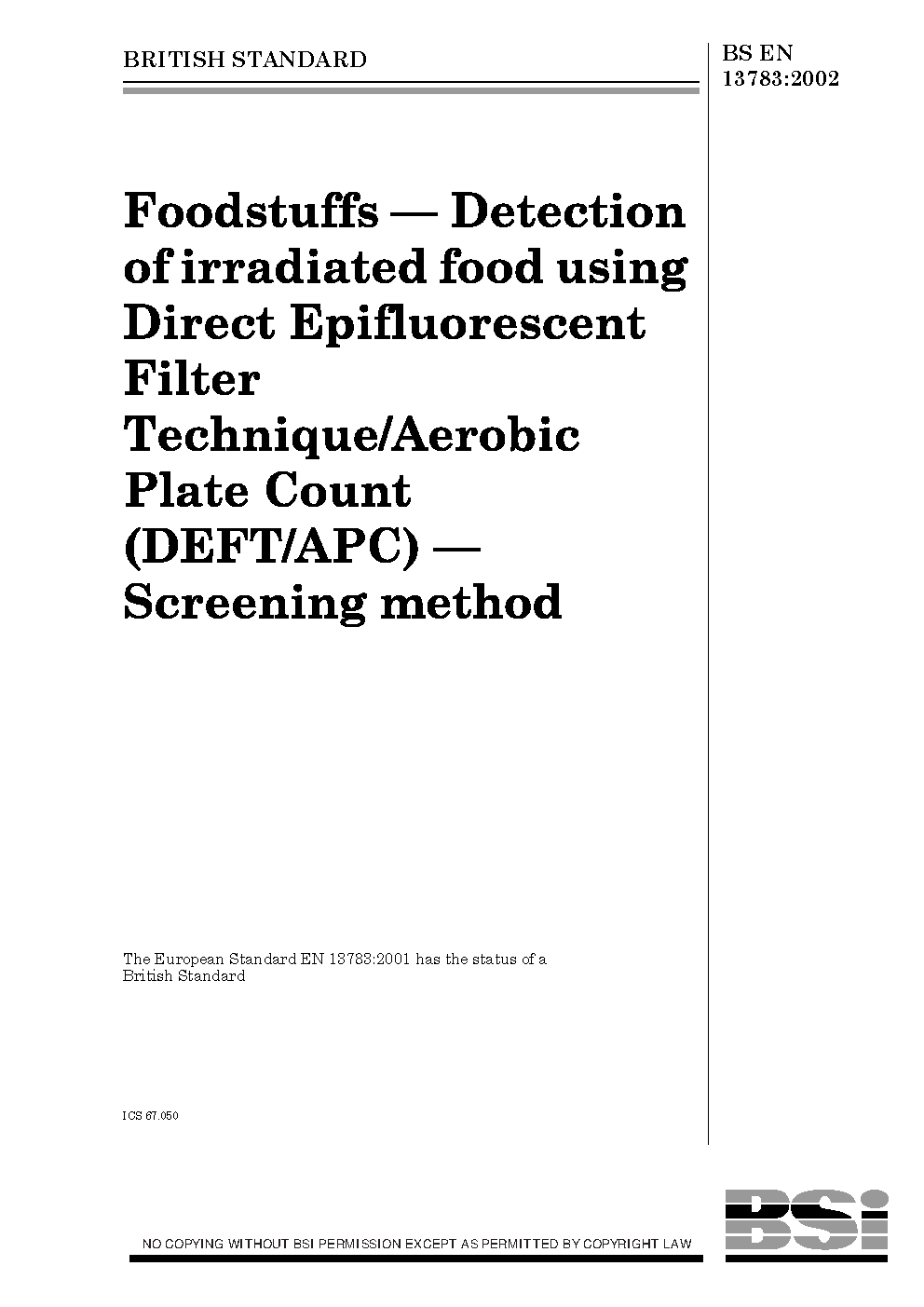Foodstuffs. Detection of irradiated food using Direct Epifluorescent Filter Technique/Aerobic Plate Count (DEFT/APC). Screening method