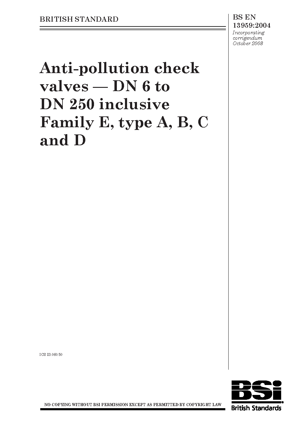 Anti-pollution check valves. DN 6 to DN 250 inclusive Family E, type A, B, C, and D