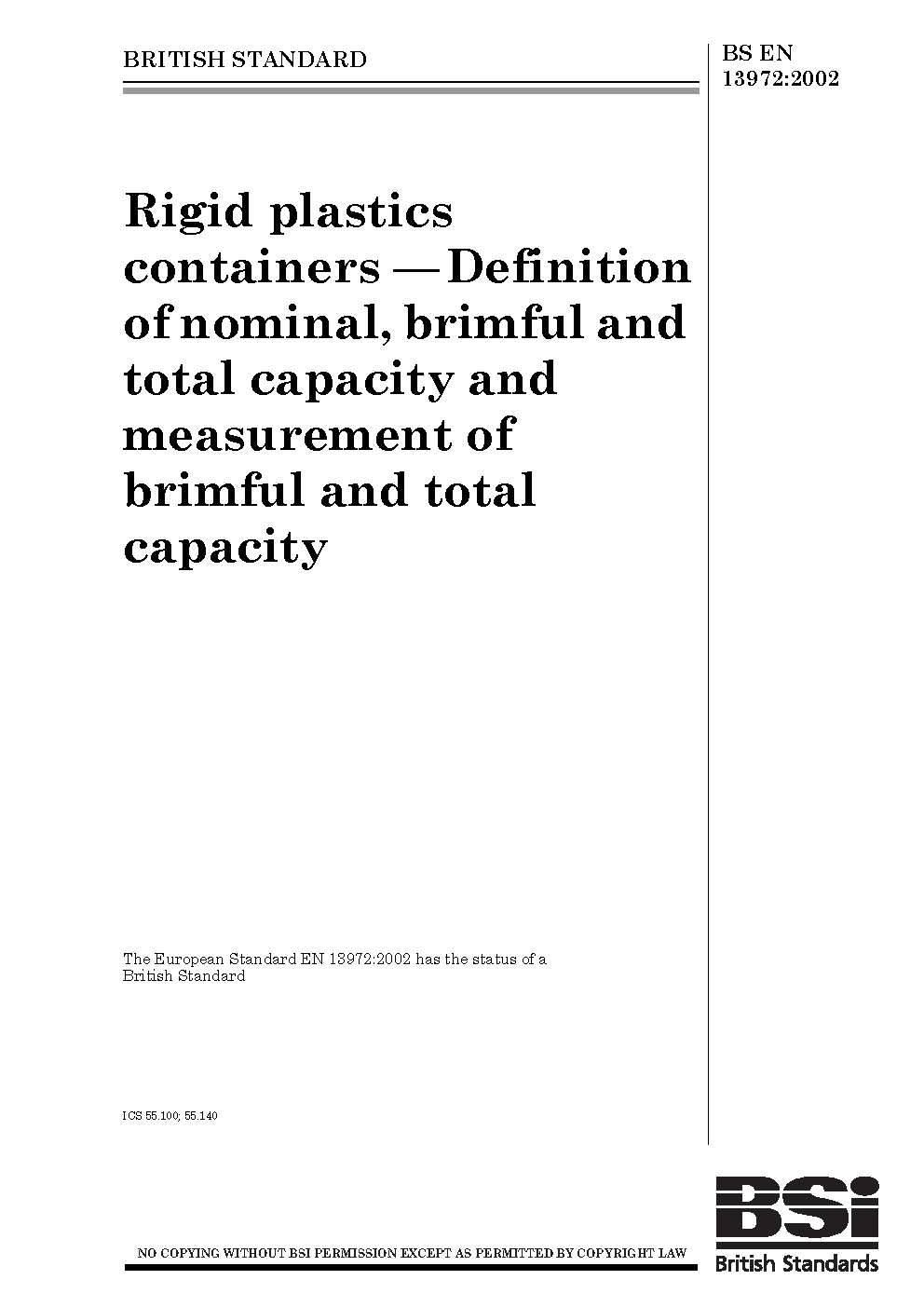 Rigid plastic containers. Definition of nominal, brimful and total capacity and measurement of brimful and total capacity