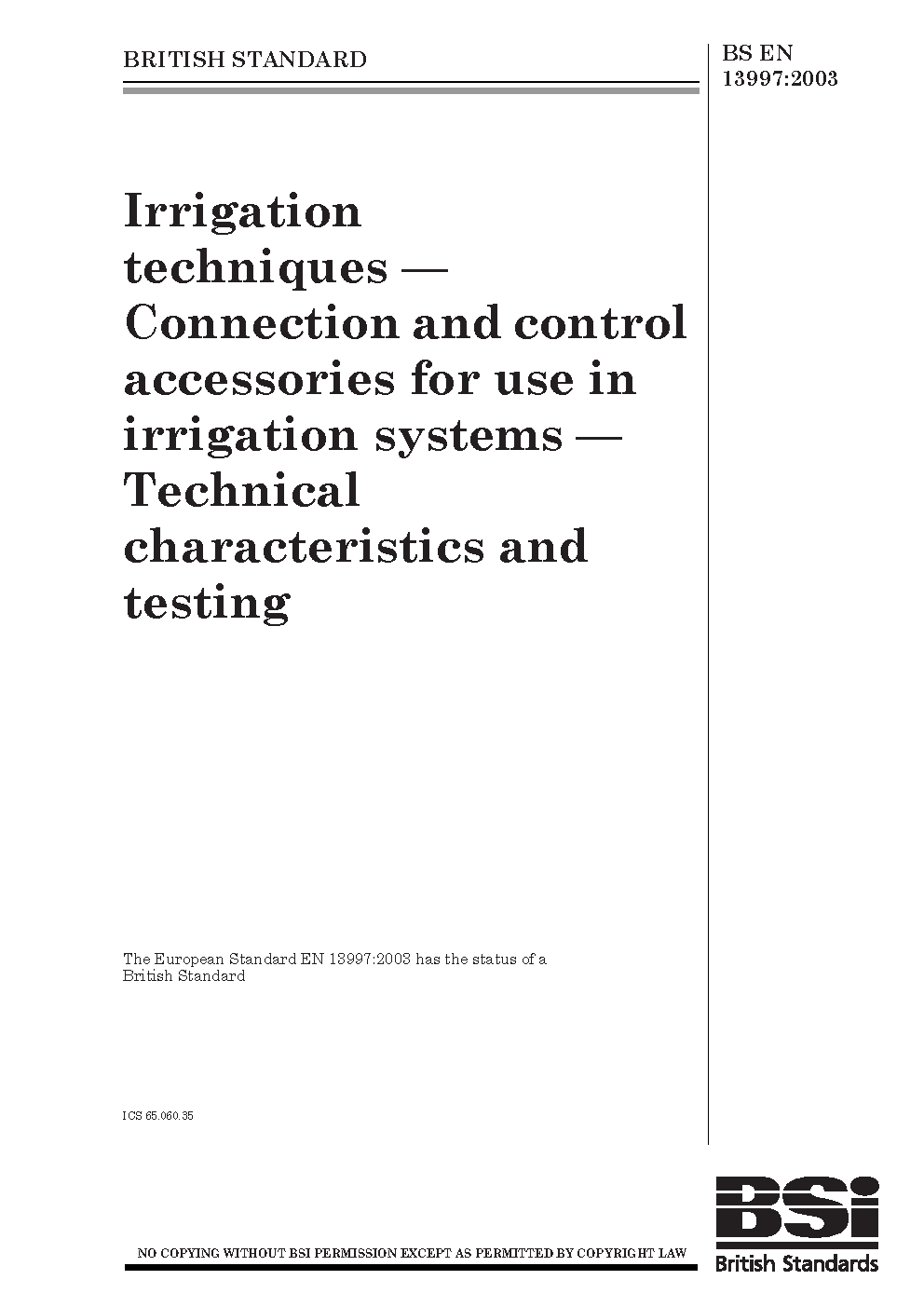 Irrigation techniques. Connection and control accessories for use in irrigation systems. Technical characteristics and testing