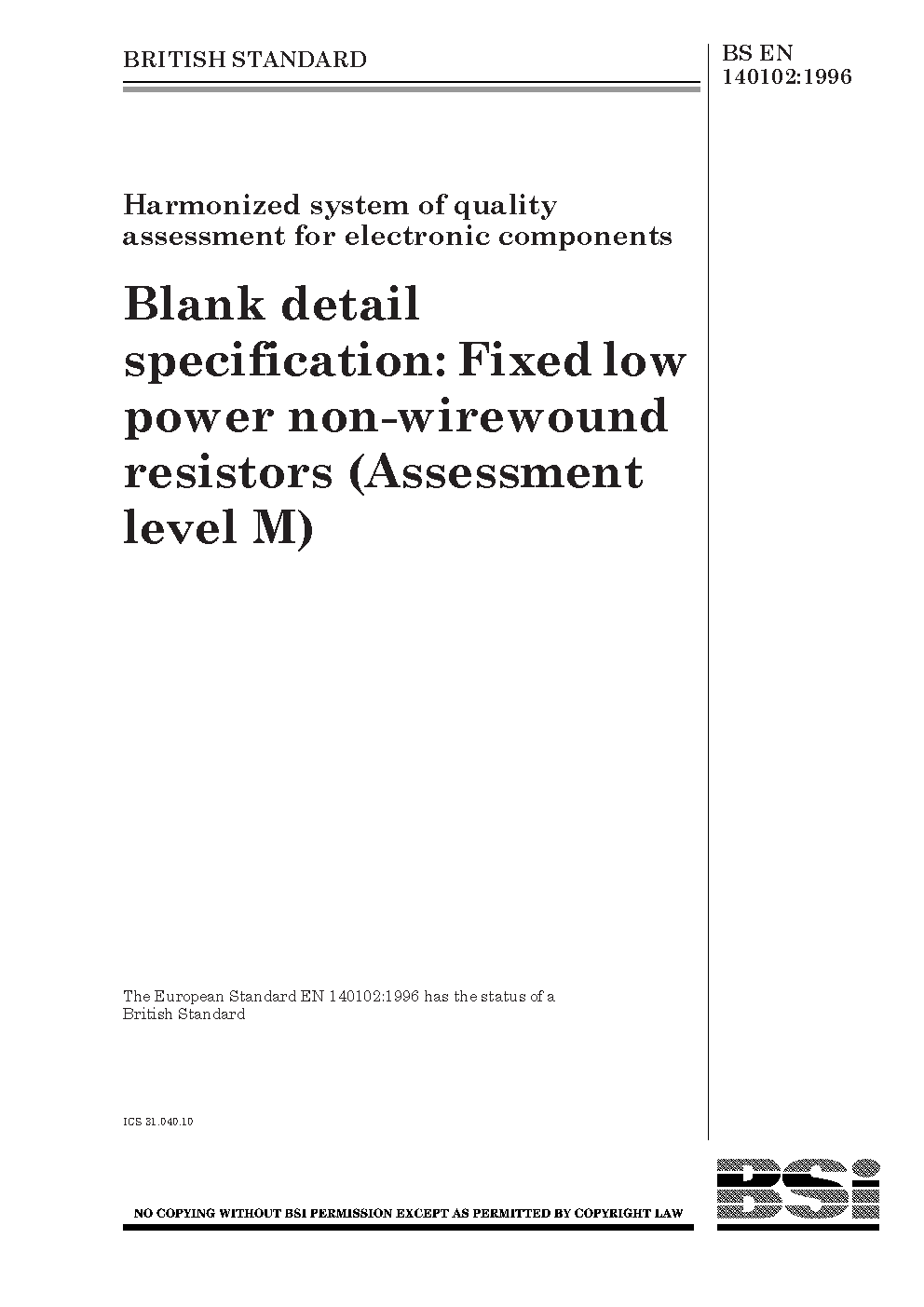 Harmonized system of quality assessment for electronic components. Blank detail specification: fixed low power non-wirewound resistors (assessment level M)