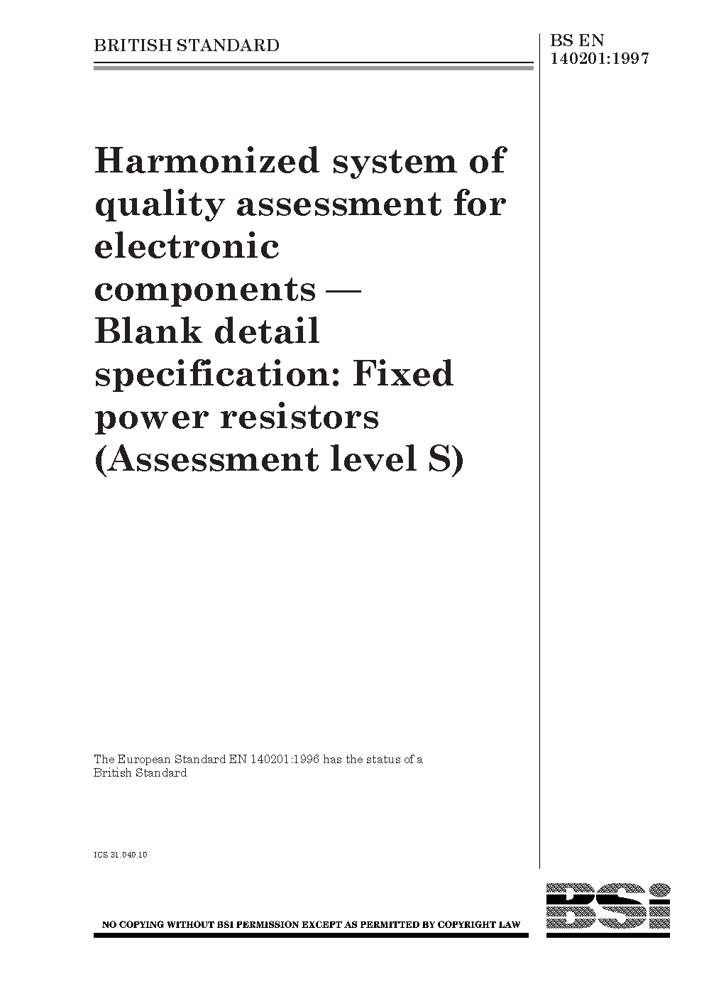 Harmonized system of quality assessment for electronic components. Blank detail specification: fixed power resistors (Assessment level S)