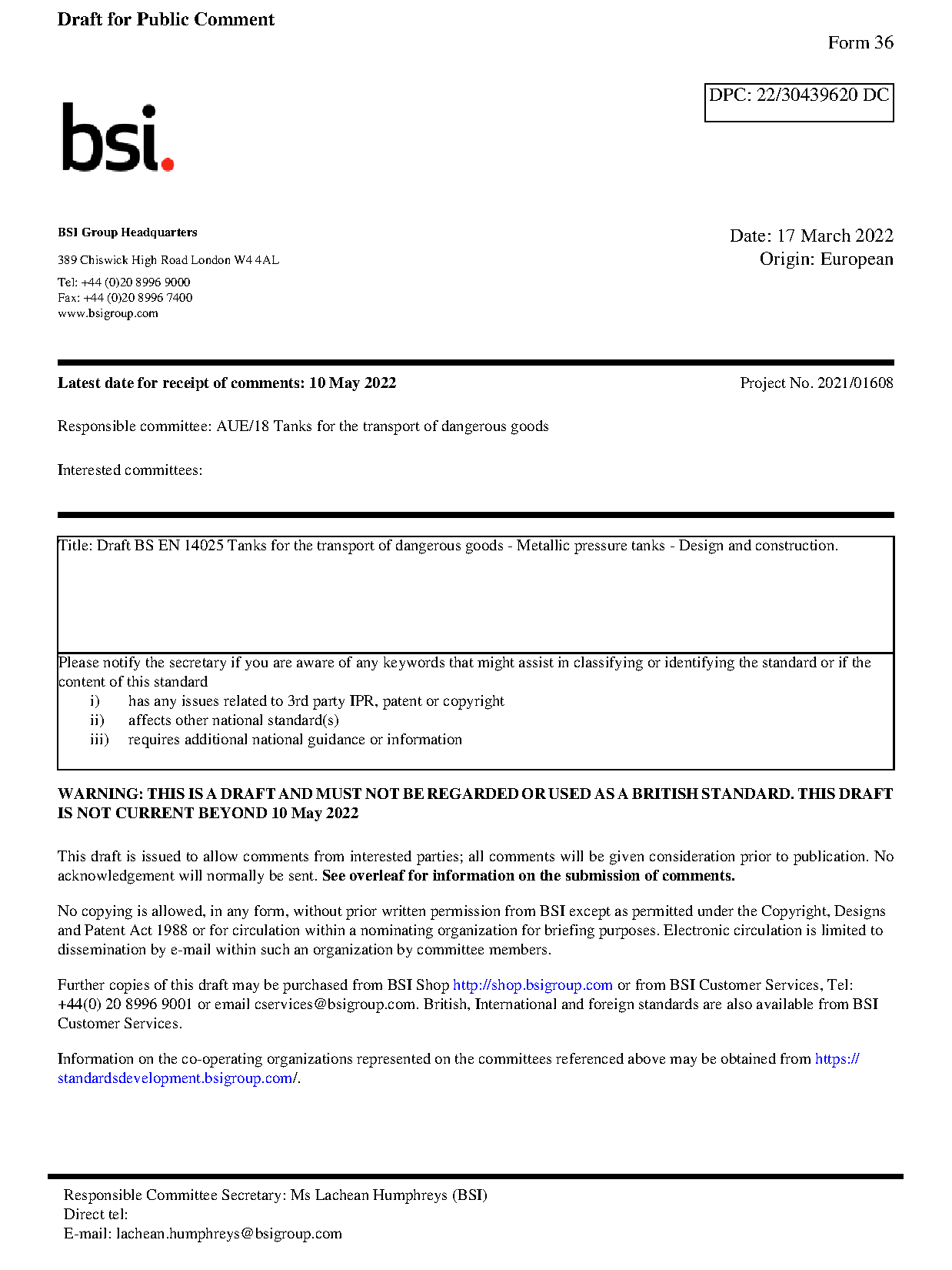 Tanks for the transport of dangerous goods. Metallic pressure tanks. Design and Construction