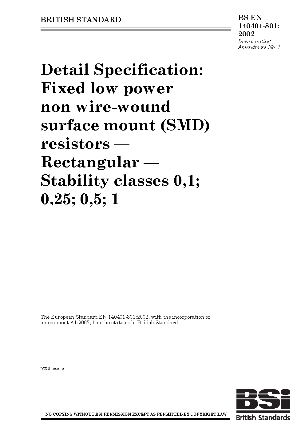Detail specification. Fixed low power non wire-wound surface mount (SMD) resistors Rectangular. Stability classes 0,1; 0,25; 0,5; 1
