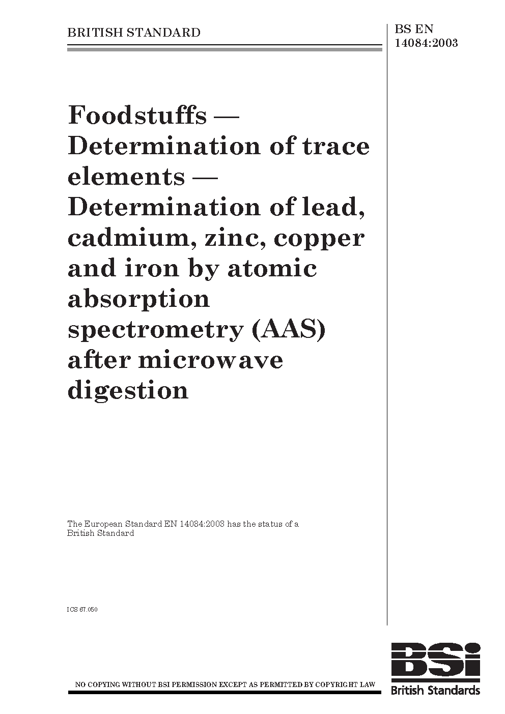Foodstuffs. Determination of trace elements. Determination of lead, cadmium, zinc, copper and iron by atomic absorption spectrometry (AAS) after microwave digestion