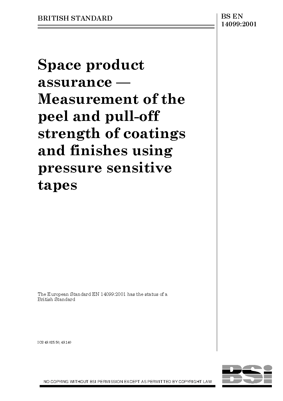 Space product assurance. Measurement of the peel and pull-off strength of coatings and finishes using pressure-sensitive tapes