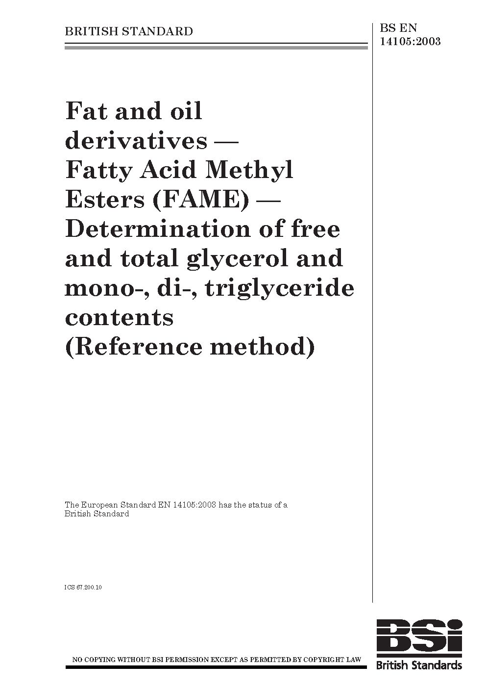 Fat and oil derivatives. Fatty acid methyl esters (FAME). Determination of free and total glycerol and mono-, di-, triglyceride contents (Reference method)