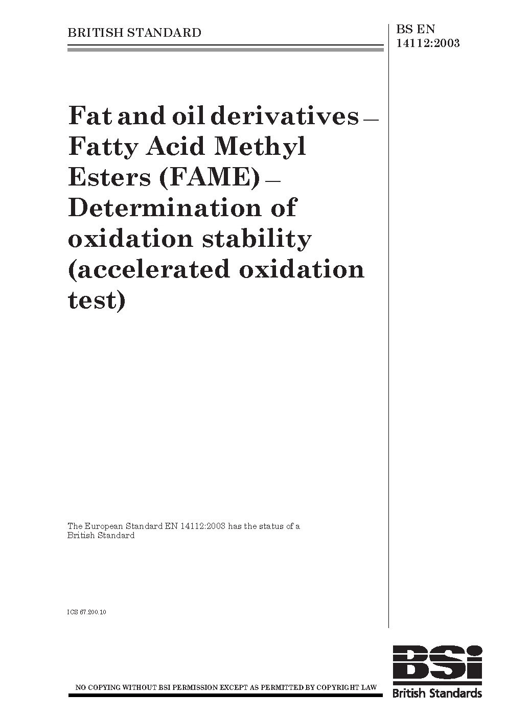 Fat and oil derivatives. Fatty acid methyl esters (FAME). Determination of oxidation stability (accelerated oxidation test)