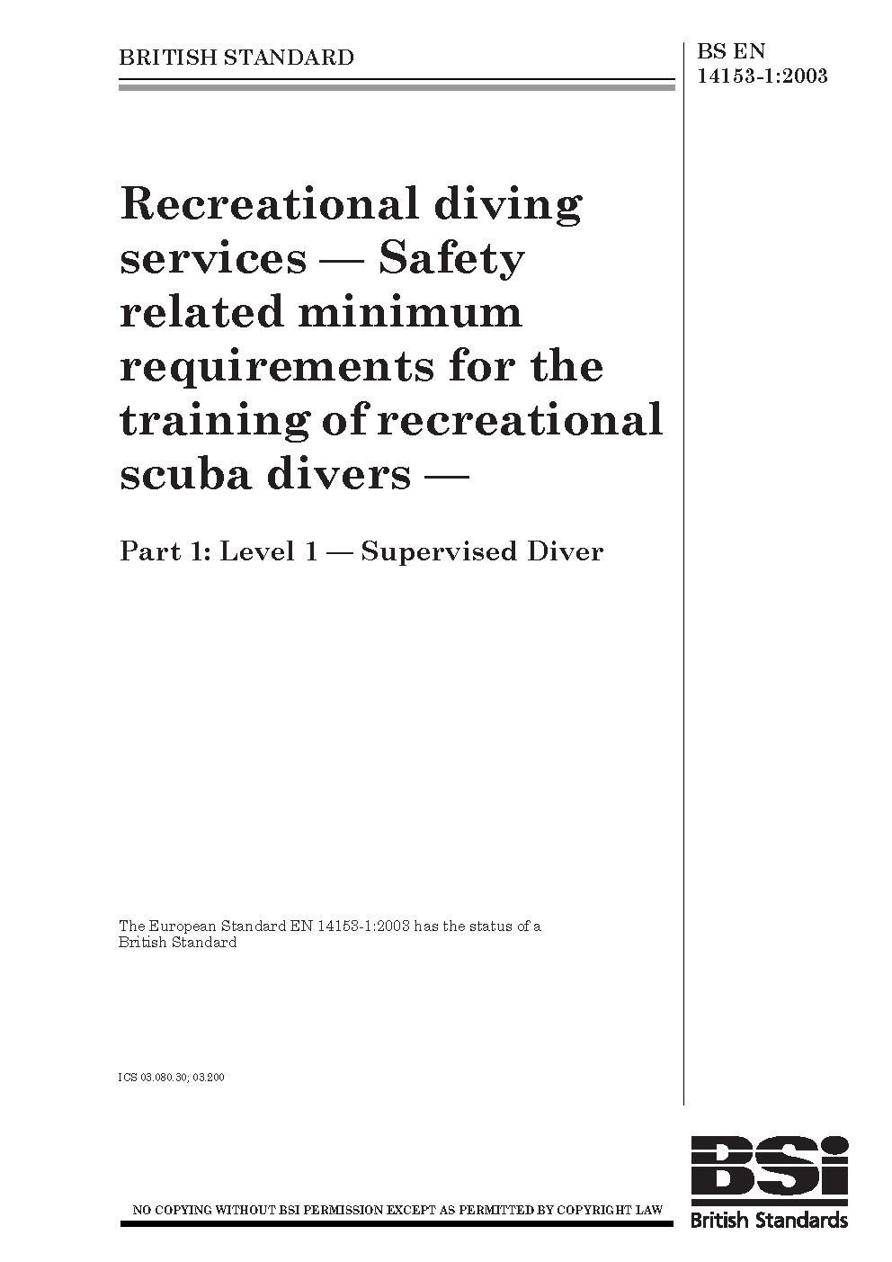 Recreational diving services. Safety related minimum requirements for the training of recreational scuba divers Level 1. Supervised Diver