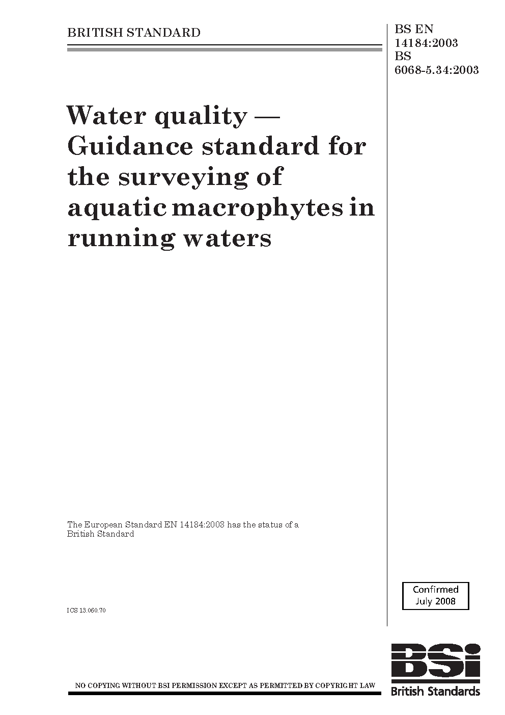 Water quality. Guidance standard for the surveying of aquatic macrophytes in running waters