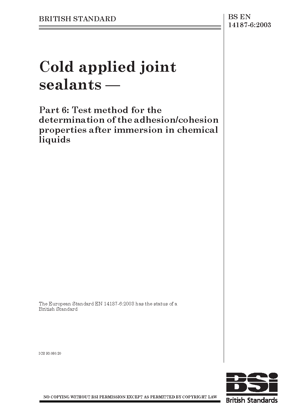 Cold applied joint sealants Test method for the determination of adhesion/cohesion properties after immersion in chemical liquids