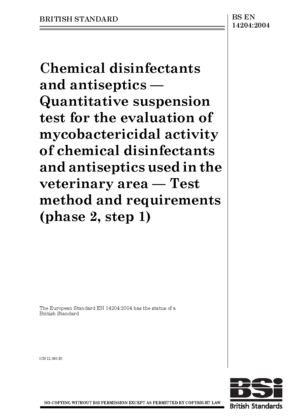 Chemical disinfectants and antiseptics. Quantitative suspension test for the evaluation of mycobactericidal activity of chemical disinfectants and antiseptics used in the veterinary area. (phase 2, step 1)