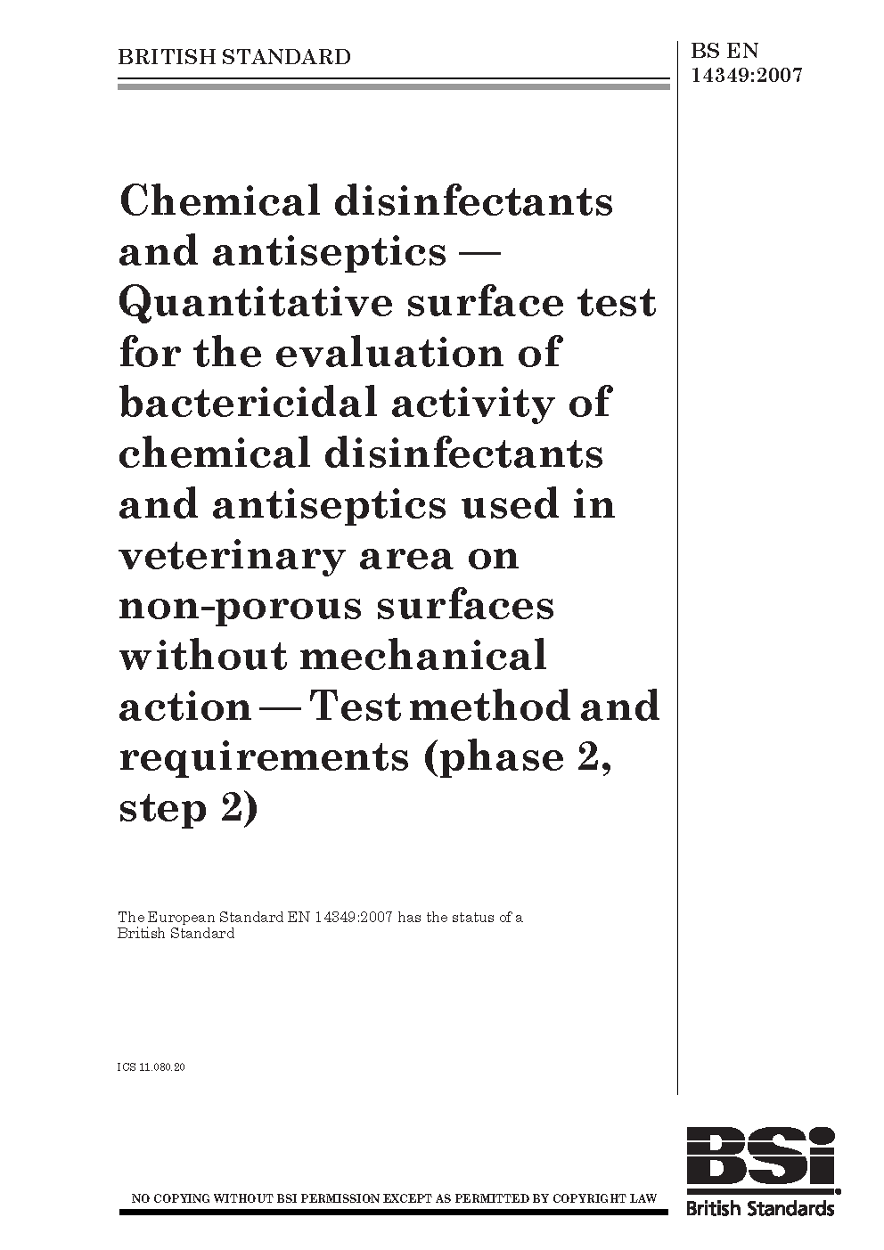 Chemical disinfectants and antiseptics. Quantitative surface test for the evaluation of bacterial activity of chemical disinfectants and antiseptics used in the veterinary field on non-porous surfaces without mechanical action. Test method and requirements (phase 2, step 2)