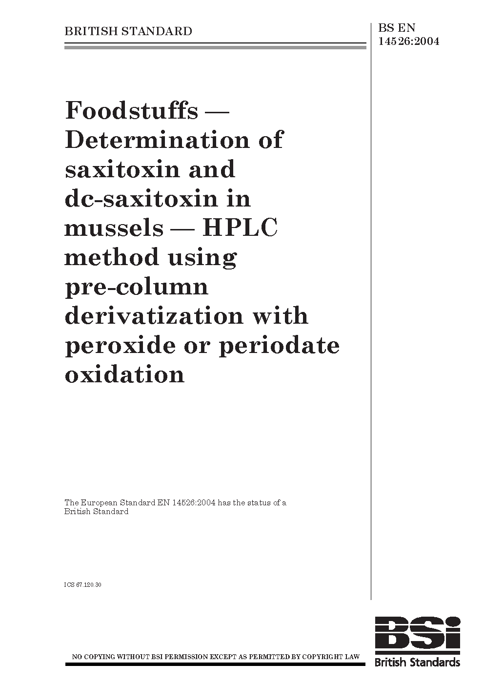 Foodstuffs. Determination of saxitoxin and dc-saxitoxin in mussels. HPLC method using pre-column derivatization with peroxide or periodate oxidation