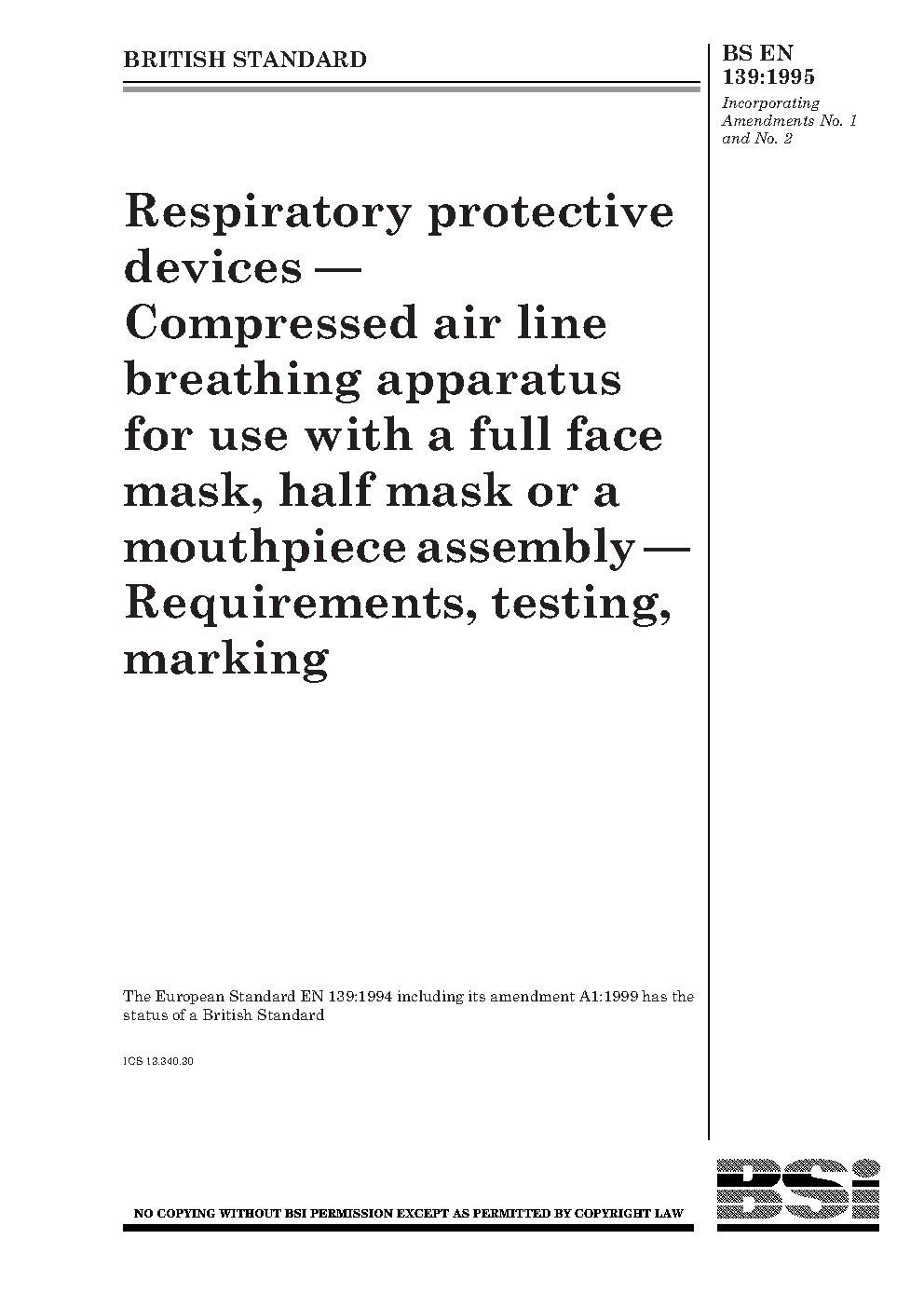 Respiratory protective devices. Compressed air line breathing apparatus with demand valve Apparatus a full mask. Requirements, testing, marking