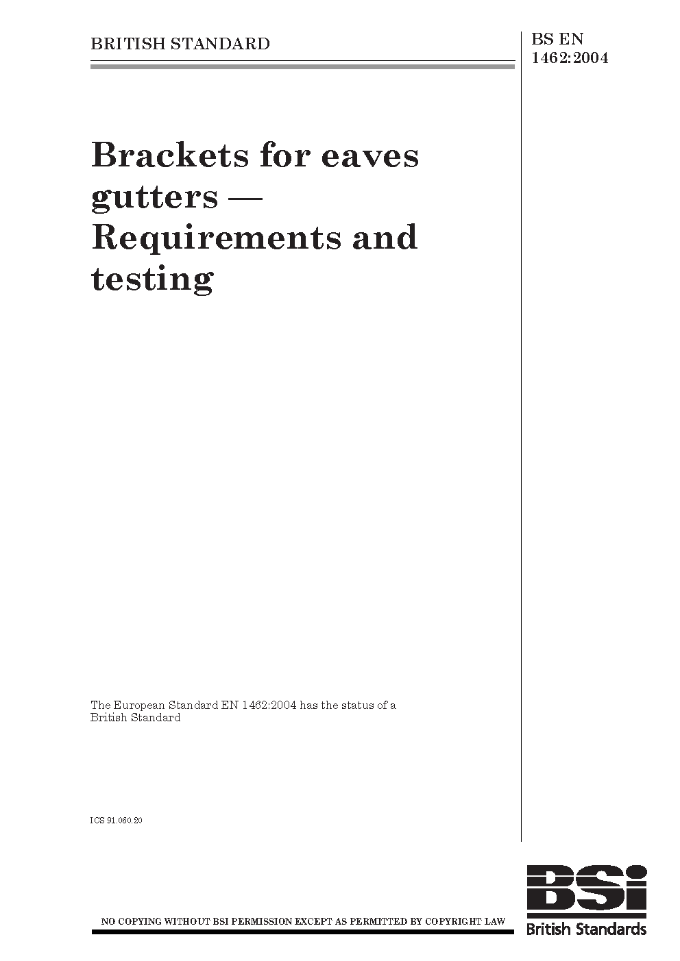 Holes;Corrosion tests;Loading;Eaves gutters;Marking;Type testing;Grades (quality);Unplasticized polyvinyl chloride;Gutters;Aluminium;Corrosion resistance;Steels;Rainwater control systems;Load capacity;Copper;Brackets;Supports;Designations;Corrosion protection