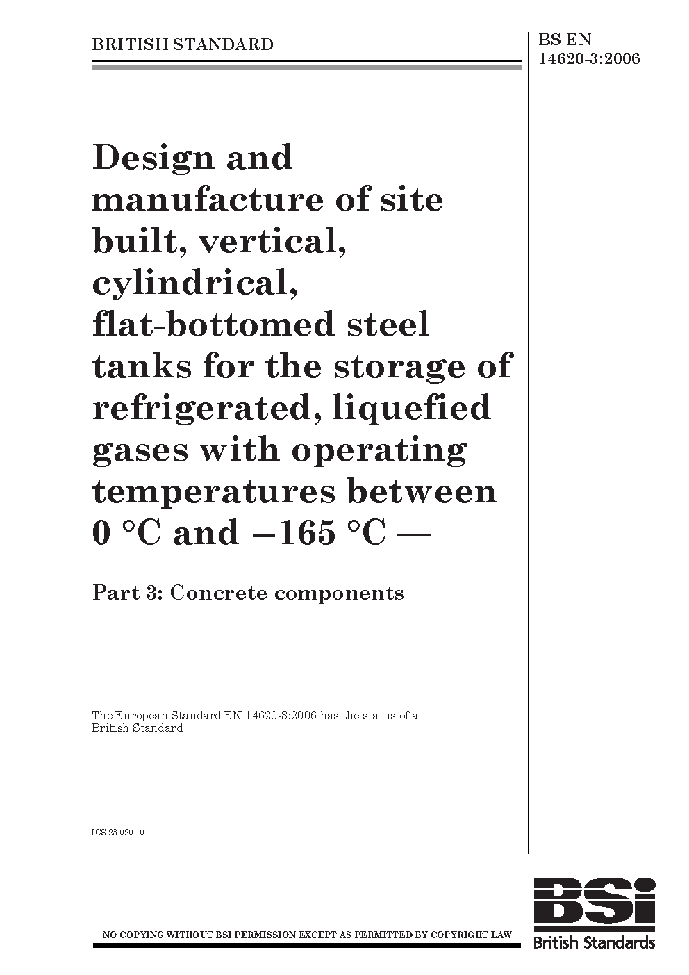 Design and manufacture of site built, vertical, cylindrical, flat-bottomed steel tanks for the storage refrigerated, liquefied gases with operating temperatures between 0°C -165°C Concrete components