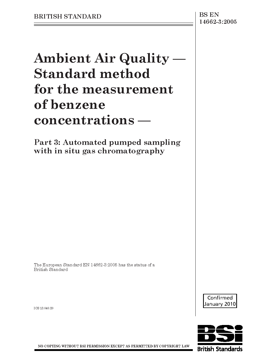 Ambient air. Standard method for the measurement of benzene concentrations Automated pumped sampling with in situ gas chromatography