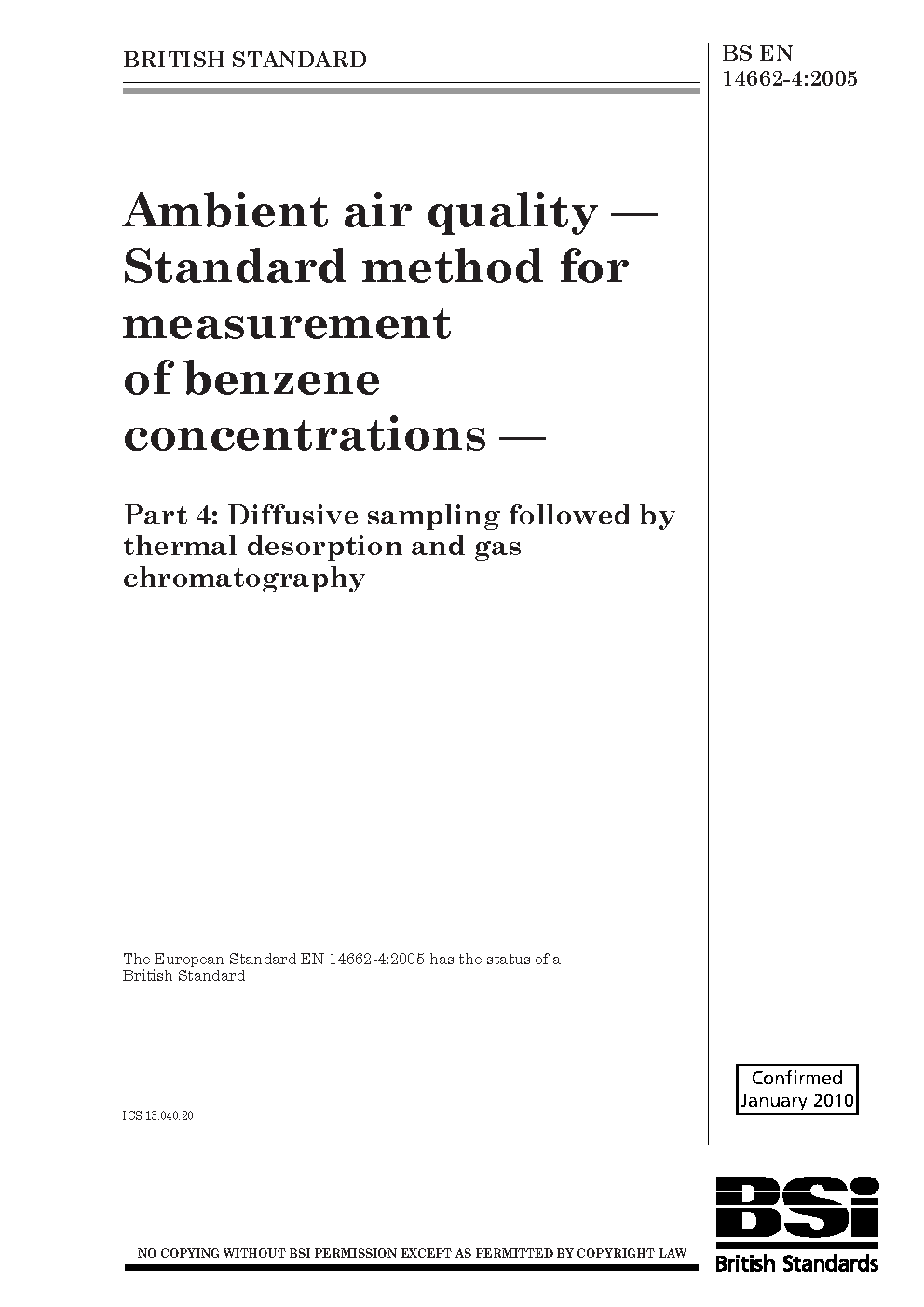 Ambient air quality. Standard method for measurement of benzene concentrations Diffusive sampling followed by thermal desorption and gas chromatography
