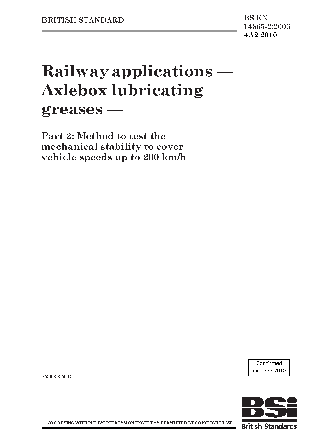 Axle boxes;Lubricating oils;Railway vehicles;Bearings;Railway equipment;Railway vehicle components;Lubricants;Quality control;Stability;Impact testing;Mechanical testing;Lubrication;Approval testing;Grease;Mechanical properties of materials