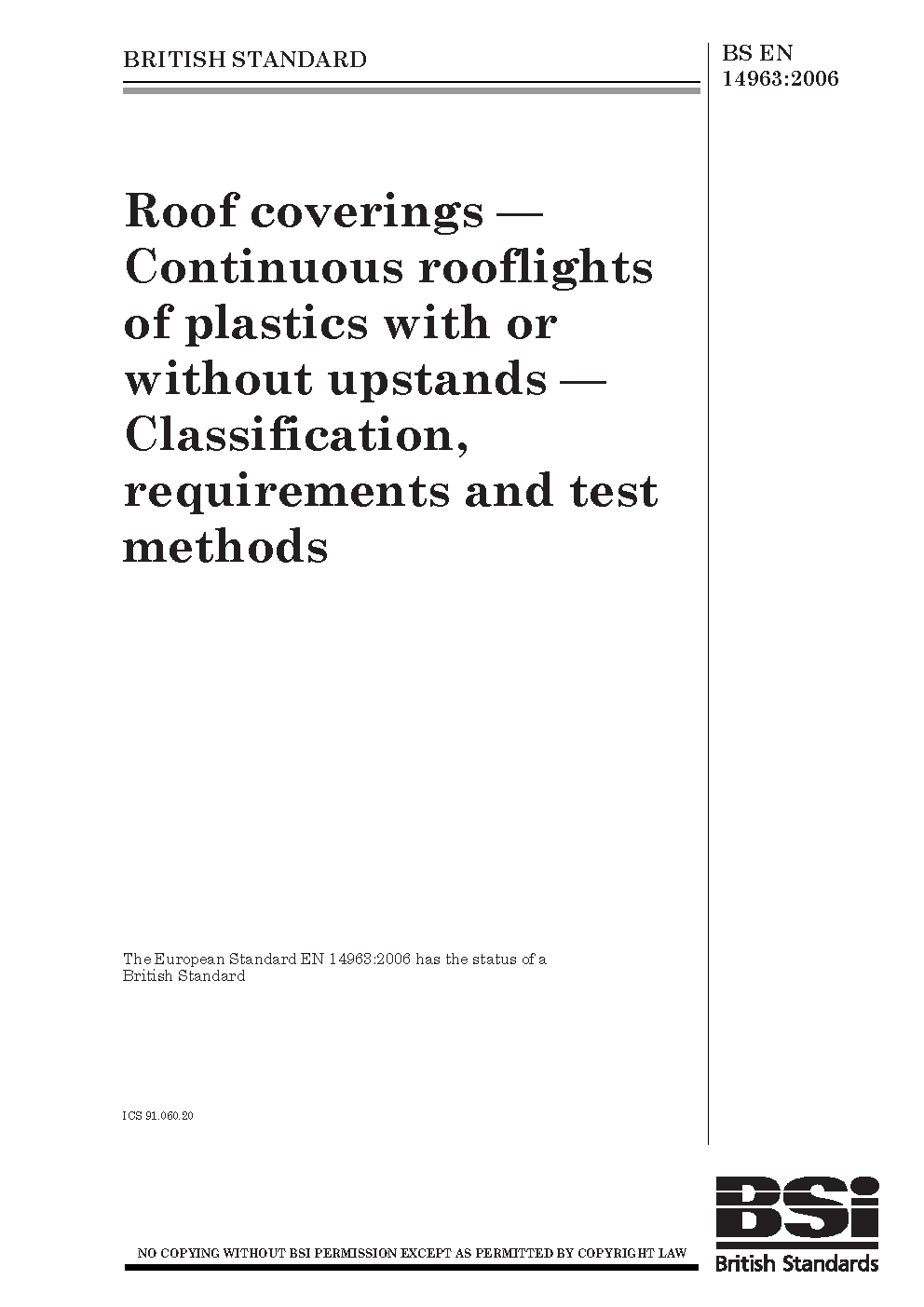 Roof coverings. Continuous rooflights of plastics with or without upstands. Classification, requirements and test methods